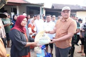 Penyerahan bantuan logistik kepada para korban banjir di Gelam Jaya Kecamatan Pasar Kemis Kabupaten Tangerang oleh H. Astahyudin Ketua DPC Partai Gerindra (foto ; Tangerangkab.go.id)