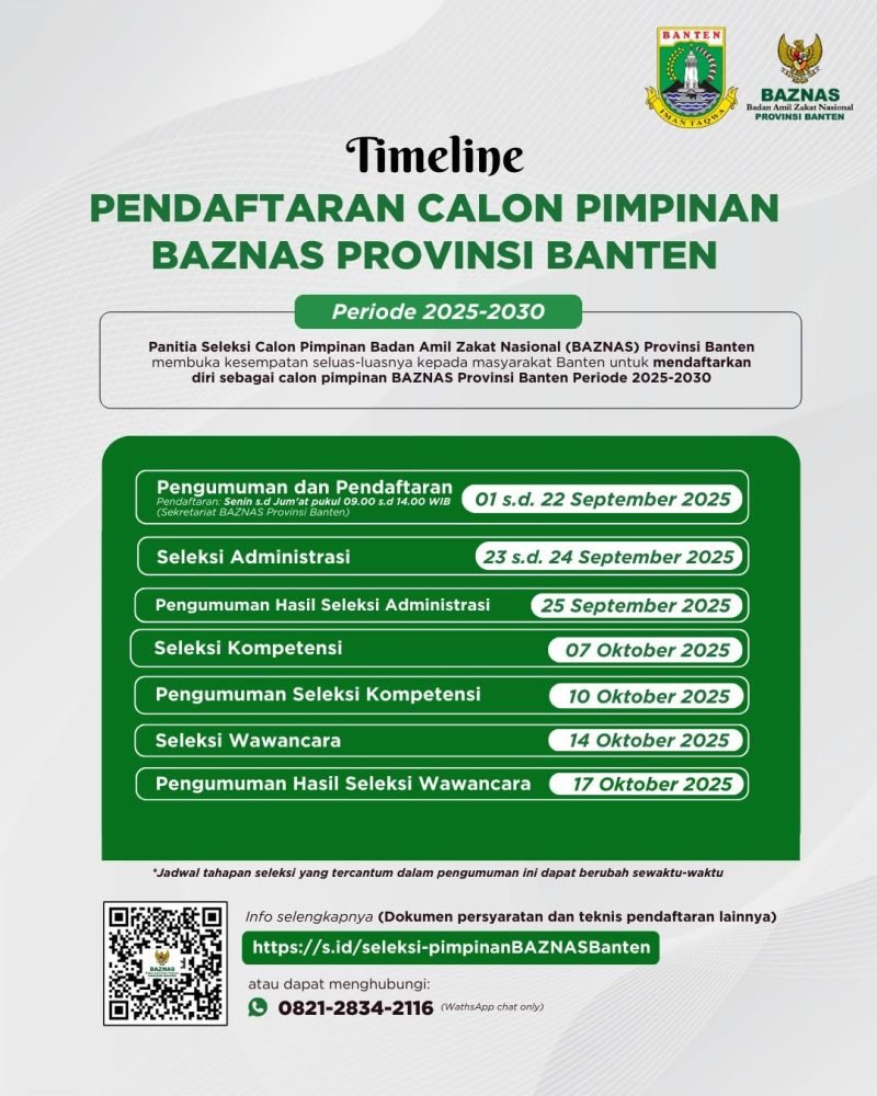 Gubernur Banten melalui Panitia Seleksi Calon Pimpinan Badan Amil Zakat Nasional (BAZNAS) Provinsi Banten membuka kesempatan seluas-luasnya kepada Masyarakat Banten untuk mendaftarkan diri sebagai calon pimpinan BAZNAS Provinsi Banten Periode 2025-2030,